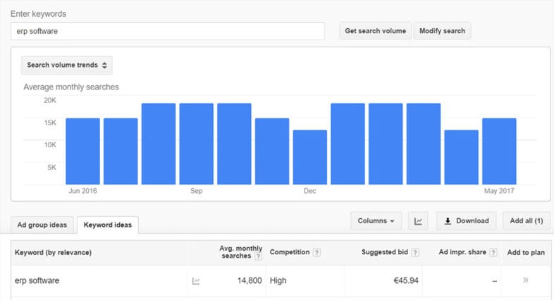 - ERP Software has a very high monthly search volume on Google in the United States with a monthly average of 14,800 searchers.