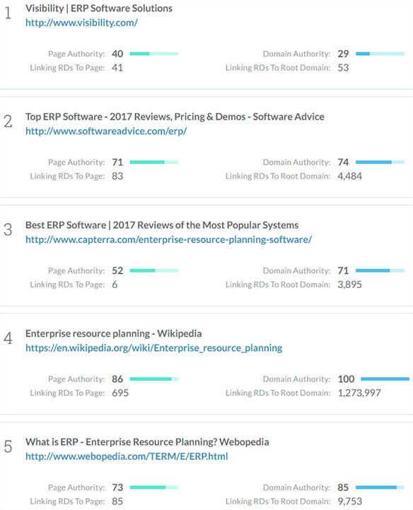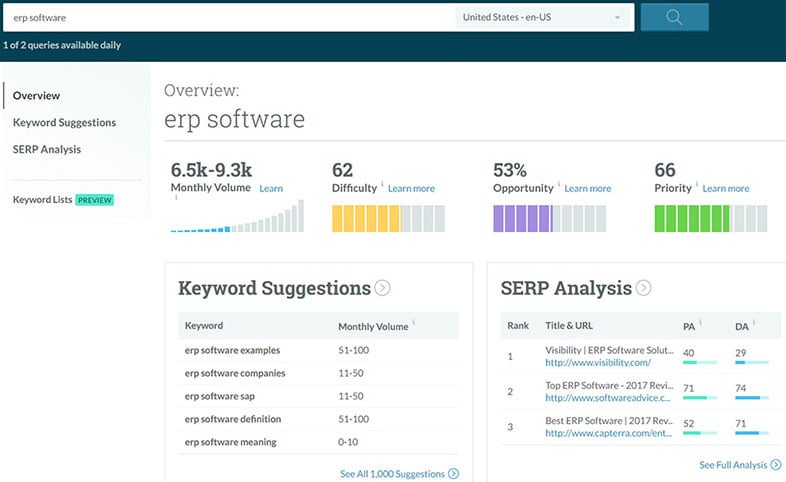 Similar to the process above for Google AdWords Keyword Planner, Moz Keyword Explorer allows you to discover and prioritize the best keywords to target. It is very simple to use, simply enter your chosen keywords and in this example, ERP Software.